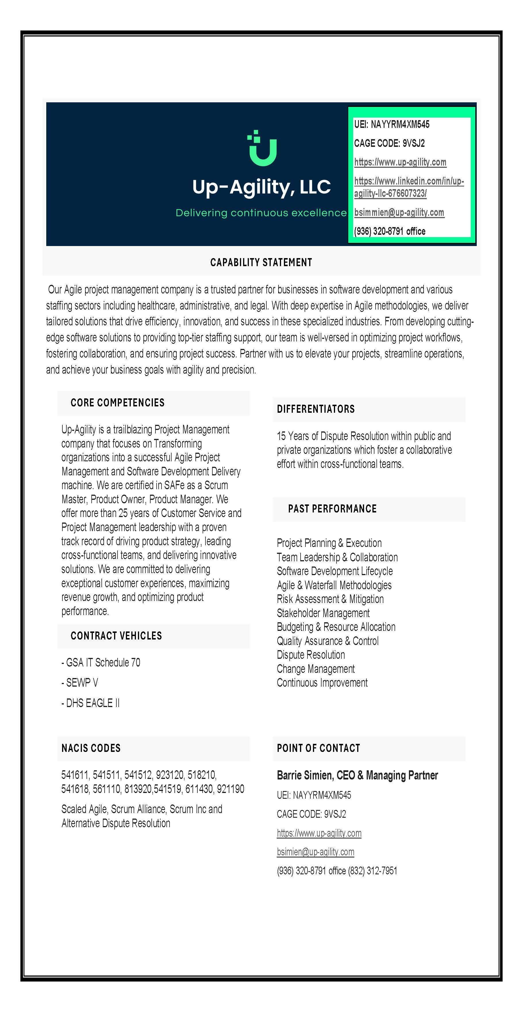 Up-Agility is a trailblazing Project Management company that focuses on Transforming organizations into a successful Agile Project Management and Software Development Delivery machine. We are certified in SAFe as a Scrum Master, Product Owner, Product Manager. We offer more than 25 years of Customer Service and Project Management leadership with a proven track record of driving product strategy, leading cross-functional teams, and delivering innovative solutions. We are committed to delivering exceptional customer experiences, maximizing revenue growth, and optimizing product performance.